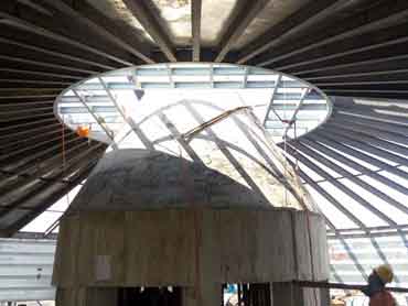 - Construye el silo de acero hasta la altura diseñada, y luego sacar la máquina, dejar caer el silo en el suelo, Hacer que el cuerpo del silo se conecte con partes pre-incrustadas en el suelo. Soldadura de la placa de cubierta del techo del silo y silo dentro de refuerzos.